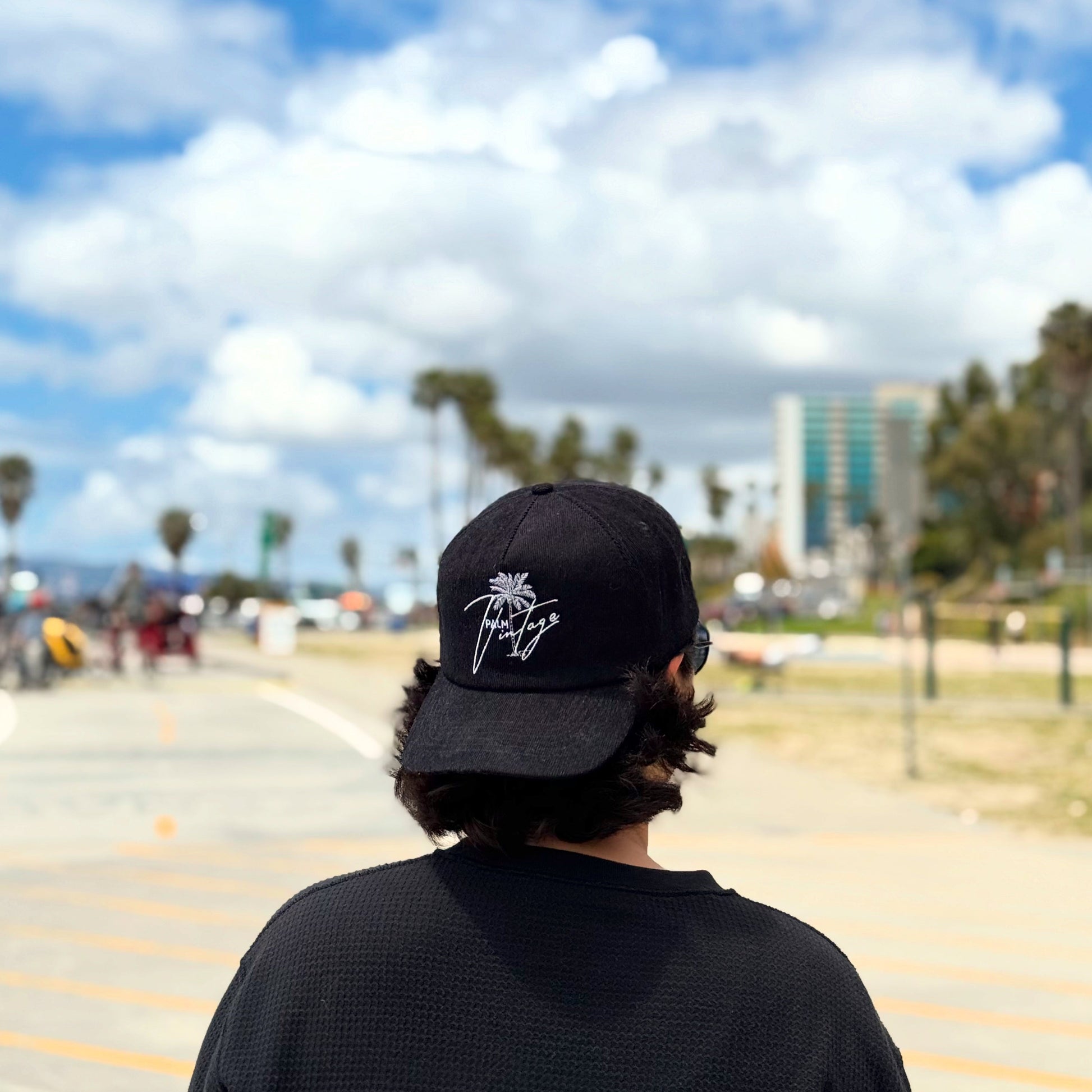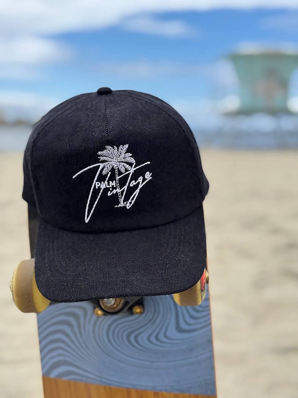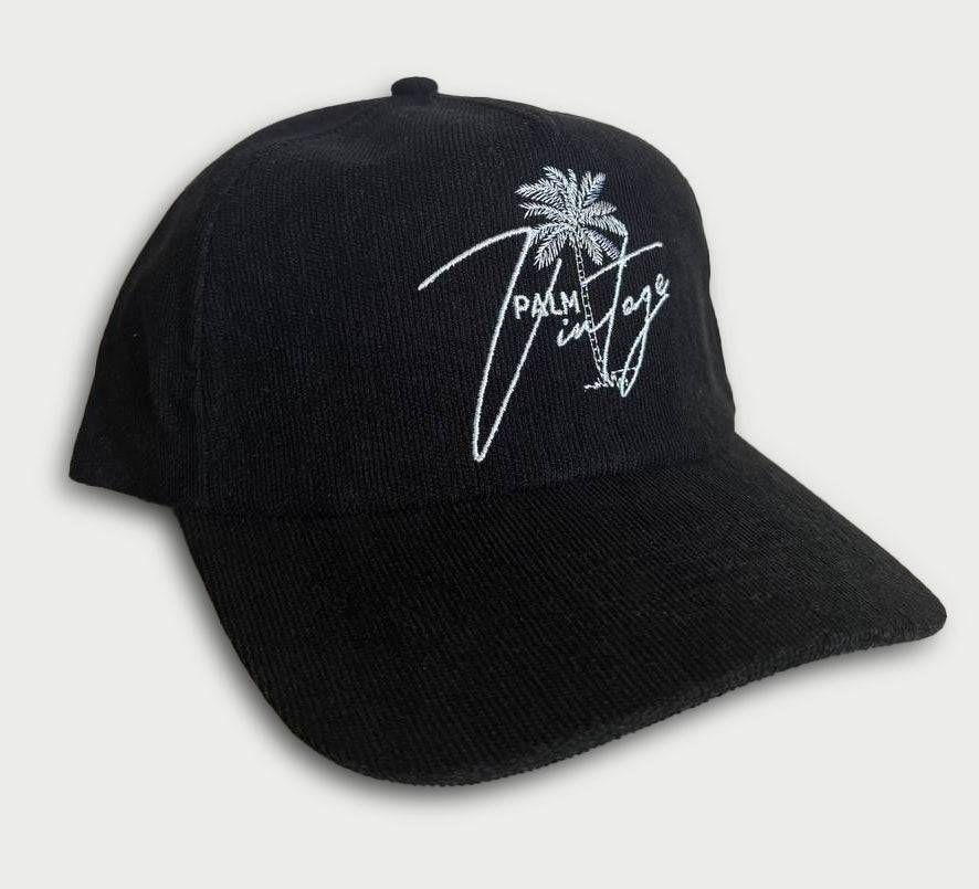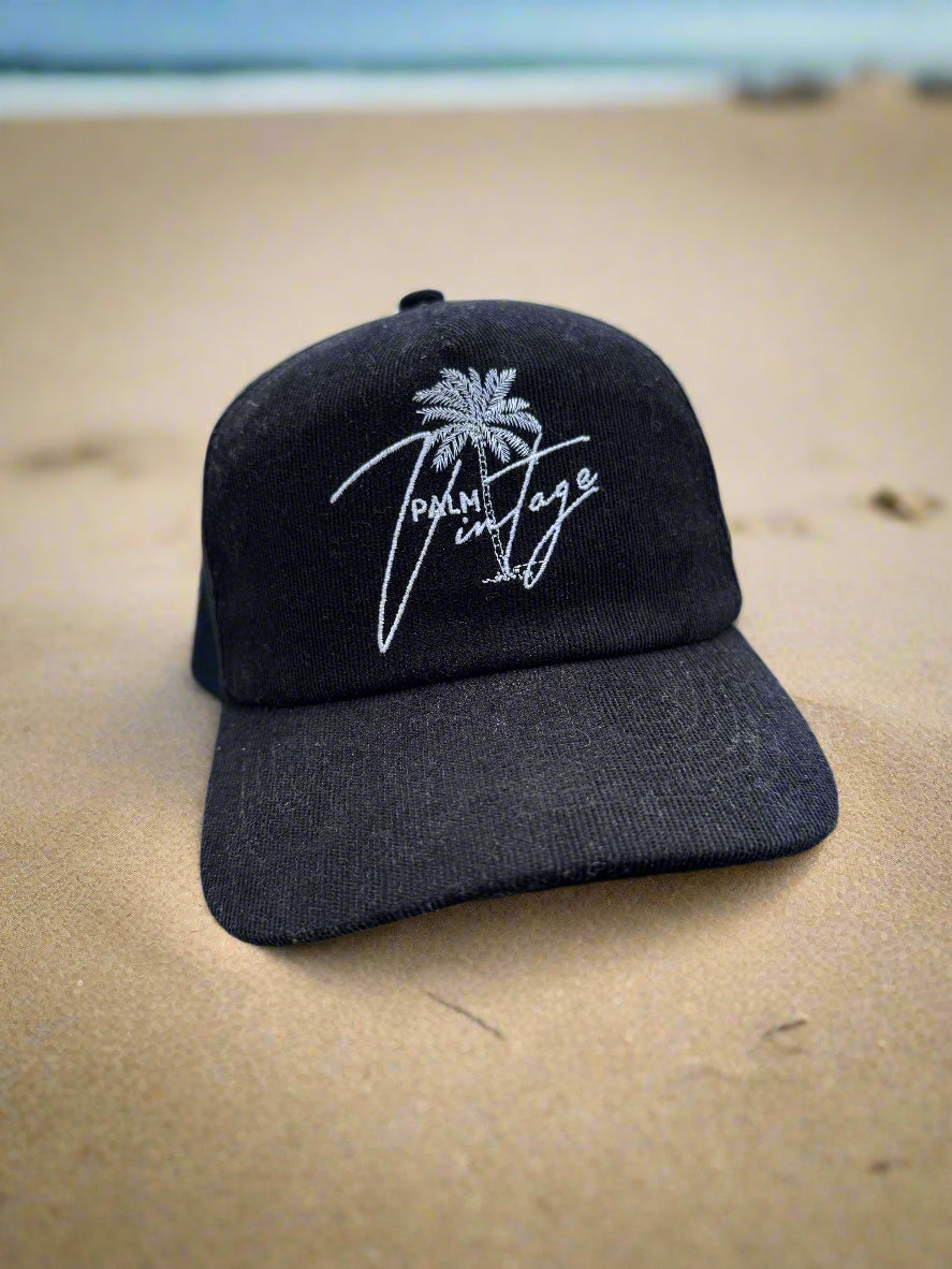 Elevate your wardrobe with a touch of tropical cool. The Palm Vintage Corduroy Cap in sleek midnight black features a minimalist yet striking embroidered design—our classic logo rising through clean, stylish lettering that reads "Palm Vintage." The white stitching pops boldly against the black backdrop, making this hat a versatile standout in any wardrobe.