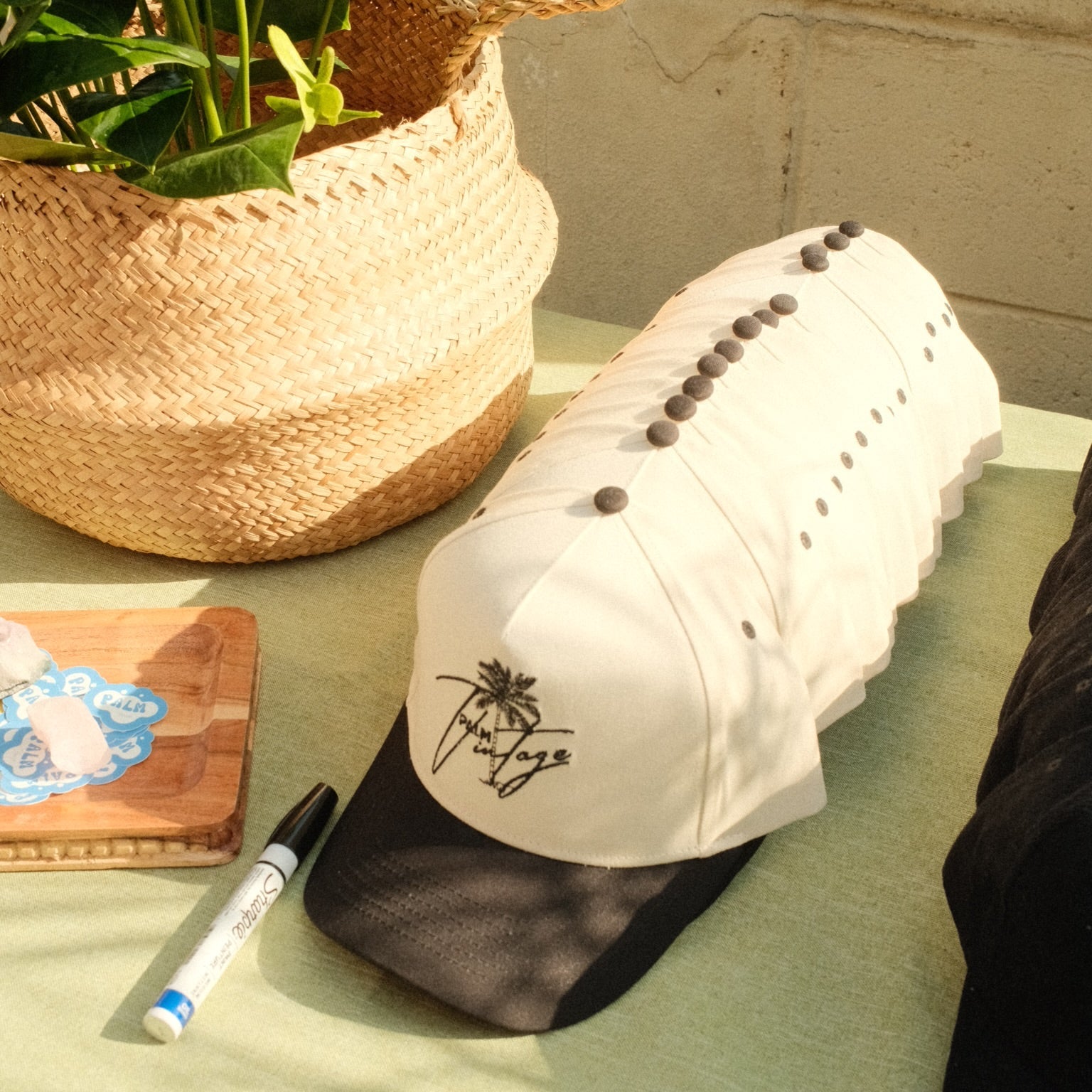 - Embroidered palm tree and “Palm Vintage” lettering